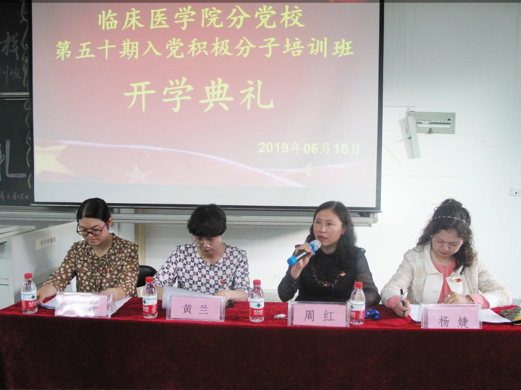 为加强对入党积极分子的教育和培养,切实增强对新时期党的路线、方针、政策的认识和理解,进一步端正入党动机,严把“入口关”,临床医学院分党校举办第五十期入党积极分子培训班并于6月18日举办了开班典礼。临床医学院党委书记周红、副书记杨婕、副处级组织员马燕萍、麻醉学院副书记黄兰及培训班全体学员参加了开班典礼,开班典礼由临床医学院党委副书记杨婕主持。开班典礼在庄严的国歌声中开始。