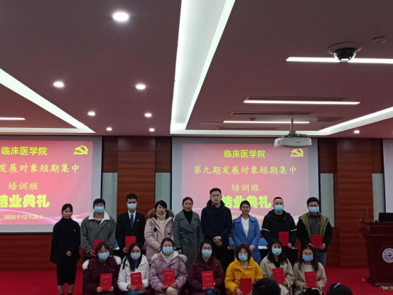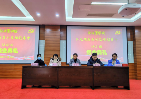 12月28日下午4:30,临床医学院在临床技能中心207举办第九期发展对象短期集中培训班结业典礼。临床医学院党委书记周红、党委副书记王筑山、护理学院党委副书记何为、2016级学生第一党支部书记以及培训班218名学员参加,会议由临床医学院副处级组织员马燕萍主持。