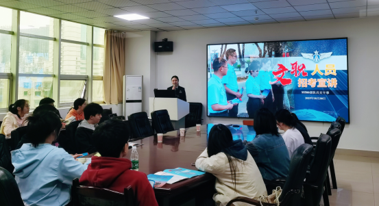 宣讲工作人员主要从军队文职人员的身份属性、报名条件(政治条件,学历条件,资格条件,身体条件,年龄条件,其他条件)、招聘岗位、待遇保障与福利、岗位晋升、招录流程等多方面进行介绍,特别是对党和国家领导人对军队文职人员的高度重视和关心,以及最新的福利政策做了详细解读。