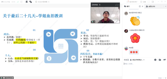 同学们在聊天区踊跃提问、积极互动,纷纷表示此次分享会“及时、解渴、实用”,不仅获取了宝贵的备考信息,更感受到了学院的温暖与力量,备考信心得到极大增强。