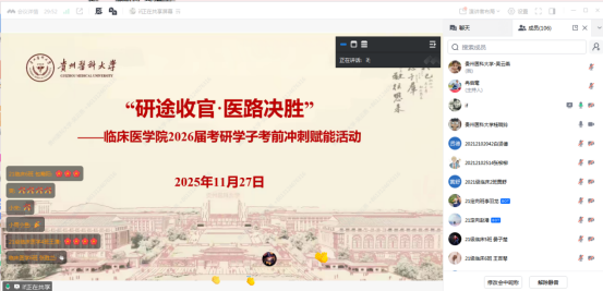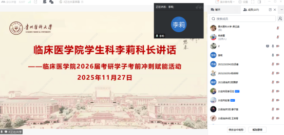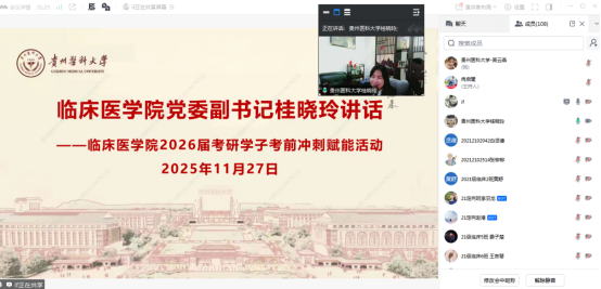 为扎实推进毕业生就业升学工作,切实提升临床医学院2026届毕业生的考研竞争力,解决学生在备考冲刺阶段的实际困惑,我院于2025年11月27日下午4:00-6:00,成功组织了 “研途收官医路决胜考研学子考前冲刺赋能活动”。旨在通过领导关怀与朋辈引领相结合的方式,为考研学子提供全方位的指导与支持。临床医学院分管学生工作的党委副书记桂晓玲(正处级)、学生科科长李莉出席了本次线上经验分享会,学院2026届毕业生全体辅导员参加,本次活动由临床医学专业2021级年级负责人唐娇莲主持。