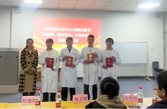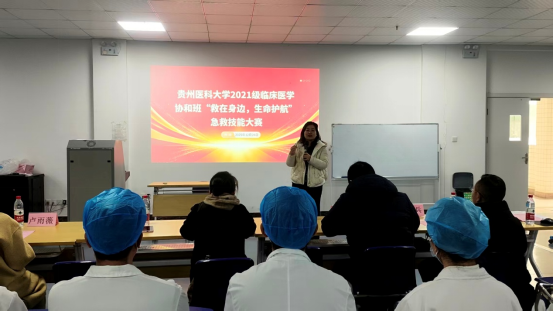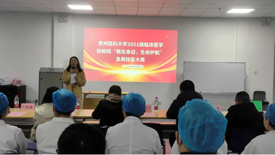 为深入贯彻党的二十届四中全会精神,弘扬“敬佑生命、救死扶伤”的医学精神,全面提升临床医学协和班学生临床思维、实践操作与团队协作能力,在教务处支持领导下,临床医学院于12月26日在临床技能中心303室,举办贵州医科大学2021级临床医学协和班“救在身边,生命护航”急救技能大赛。教务处卢雨微副处长,临床医学院桂晓玲副书记(正处级),教务处任玮科长,教务处孙晓宇副科长,临床技能中心邹丽丹副主任,协和班基础阶段班主任王念雪、杨婷老师,2021级协和班辅导员龙世英老师应邀出席大赛,急诊科韦卫琴主任、史学形副主任医师、任文兵副主任医师应邀担任评委。卢雨微副处长、桂晓玲副书记分别致辞,向本次大赛的培训教师和评委表示感谢,并鼓励学生加强学习提升临床技能。2021级协和班同学分成六组,参与角逐。