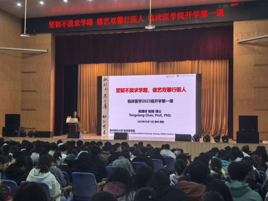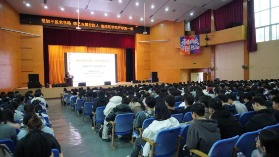 2026年3月13日,贵州医科大学临床医学院在北校区大礼堂隆重举行“坚韧不拔求学路 德艺双馨行医人”临床医学院2023级开学第一课主题讲座。本次讲座由贵州医科大学附属医院副院长、临床医学院执行院长陈腾祥担任主讲。临床医学院党委副书记(正处级)桂晓玲、临床医学院学生科科长李莉、临床医学院团委副书记吴爽、临床医学院全体辅导员及2023级年级全体学生参加本次活动。